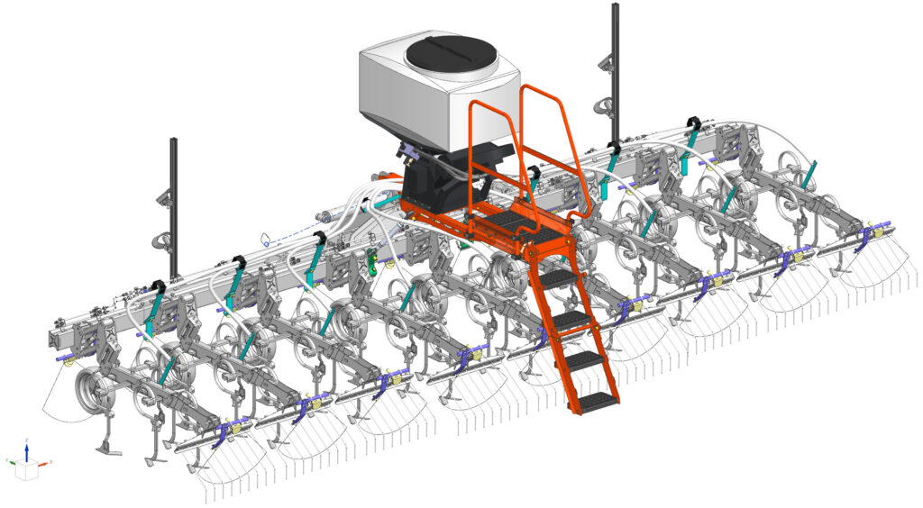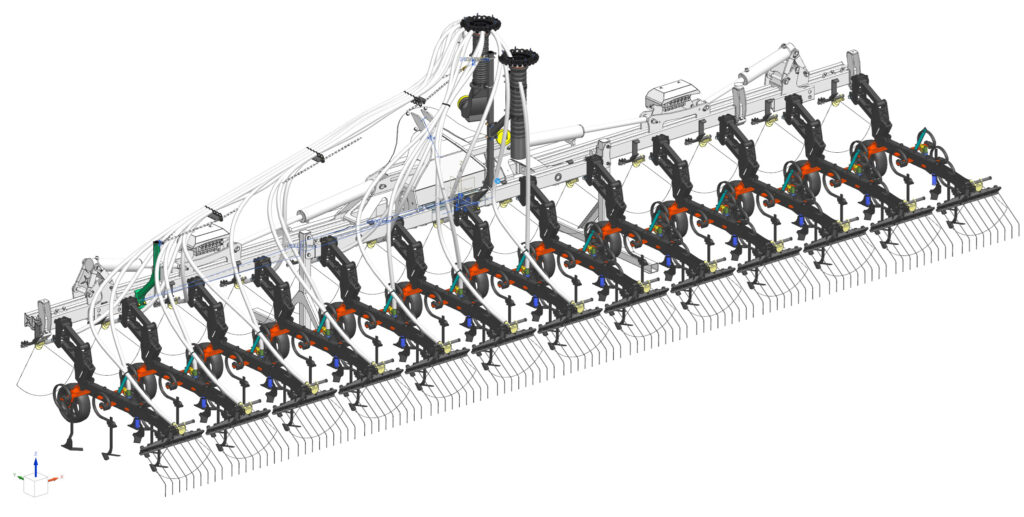 The system is fully compatible with Kubota front hoppers SH1600/SH2200, available for working widths up to 12 metres and multiple row configurations. All assemblies are delivered fully factory-installed for plug-and-play operation.
