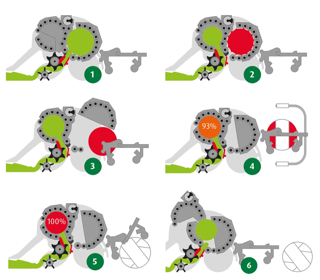 - Crop flow and pre-compressed crop are transferred to the main chamber… and the cycle continue endlessly.